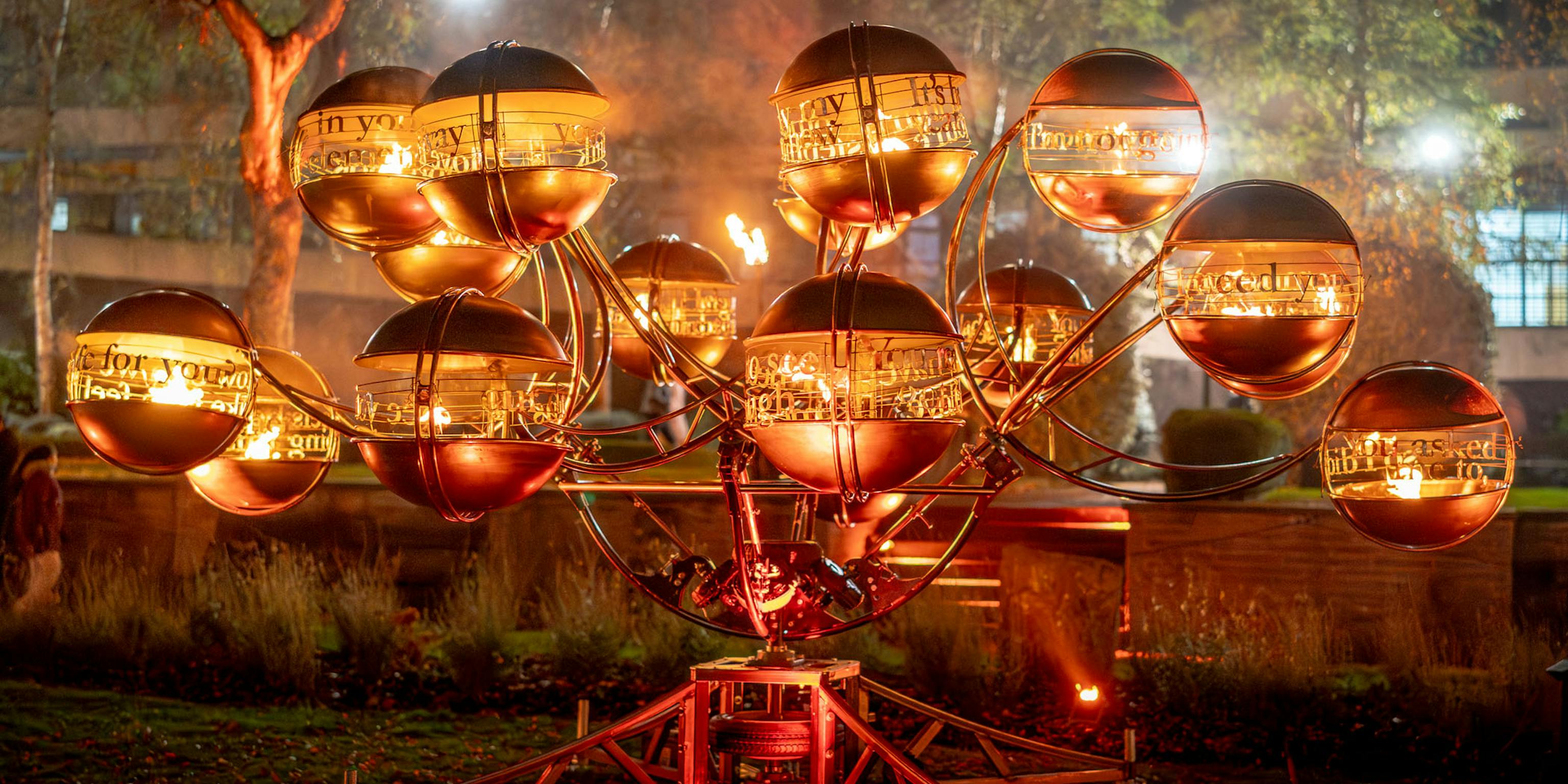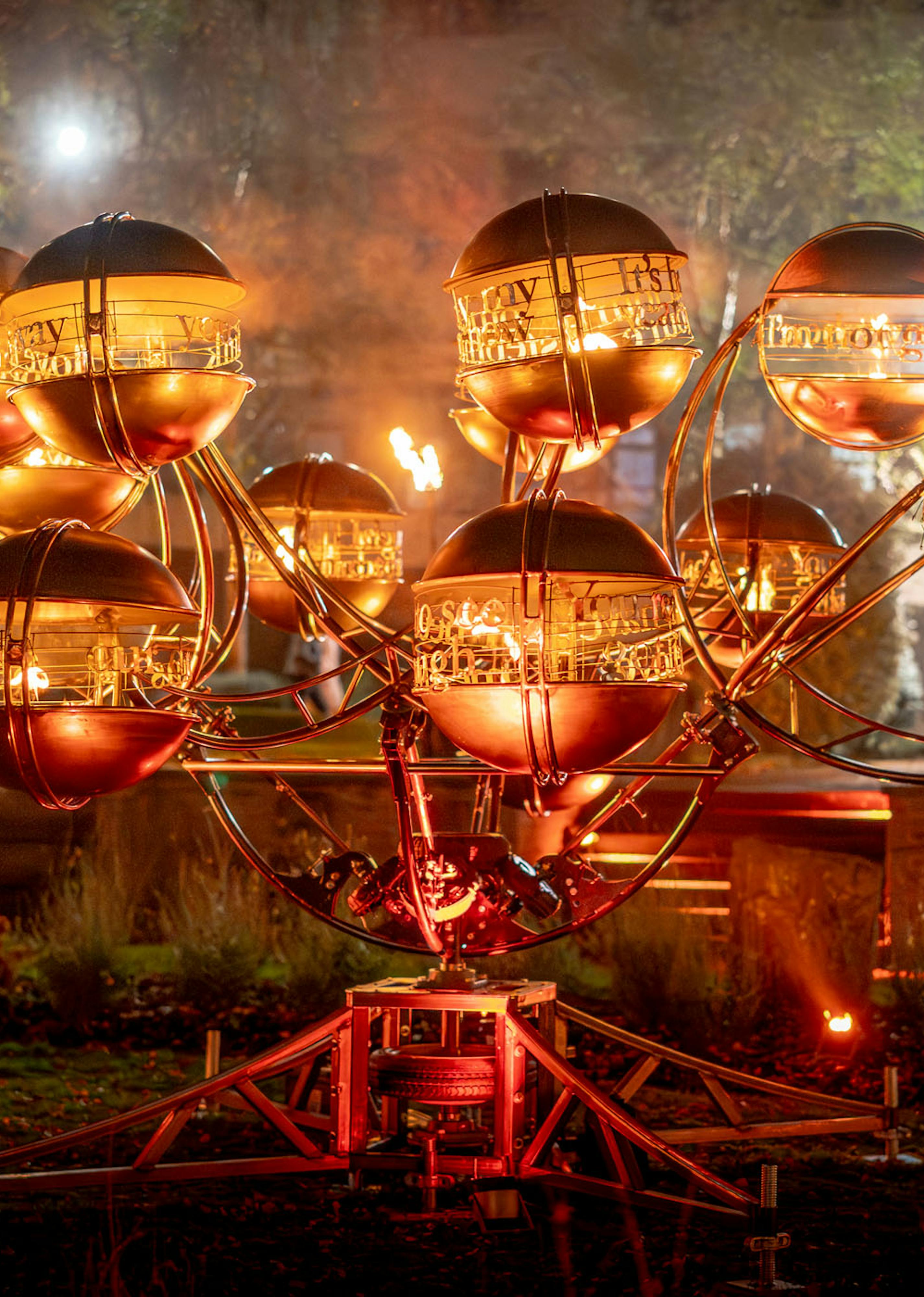 What matters to me is to make new work happen, and in 2024, we commissioned three new kinetic fire sculptures – we invited artistic proposals that included movement and sound as well as fire. I worked with the artists, and with the expertise of gas technician Tom Ferneyhough, through the commissioning process: reviewing designs, discussing materials, and looking at the storage implications for each work are all part of the journey from idea to success. I enjoy the dialogue with artists, and the challenge of solving problems by finding solutions that are sustainable and cost effective, as well as achievable in the time. We presented the new works first at Lightwaves festival in Salford, and subsequently they toured as Mechanical Marvels to other locations – such as Wales National Botanic Gardens, the Festival of Glass in Stourbridge, and to Preston. The three kinetic sculptures included The Passage by Mary Reynolds, the Daisy Chain by Mike Pattison, and In the Balance by Felix Rowberry.