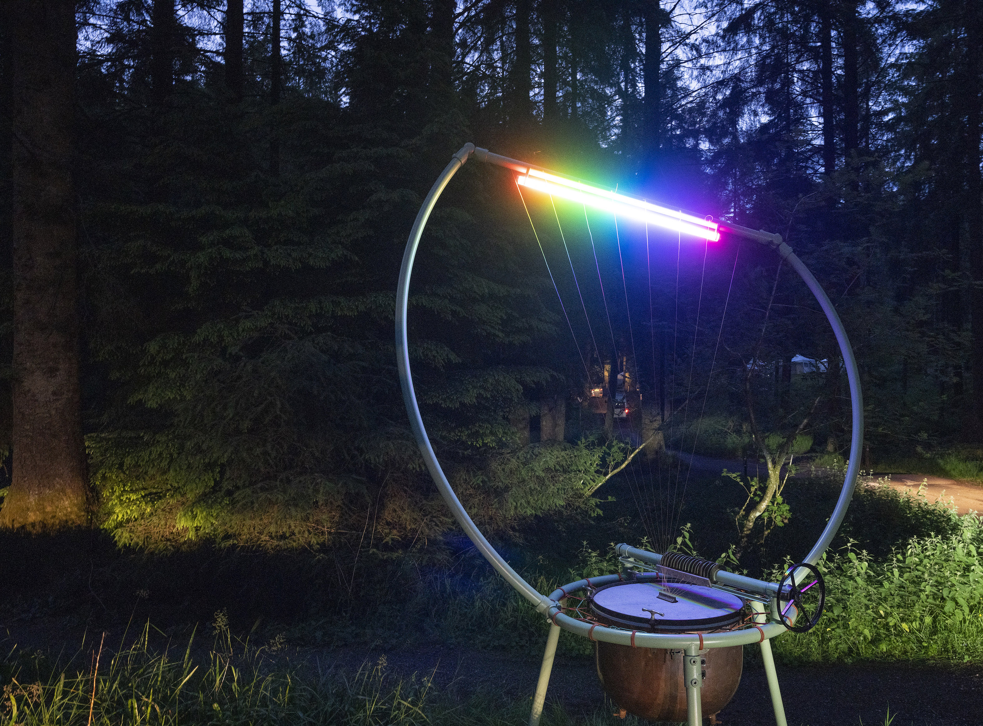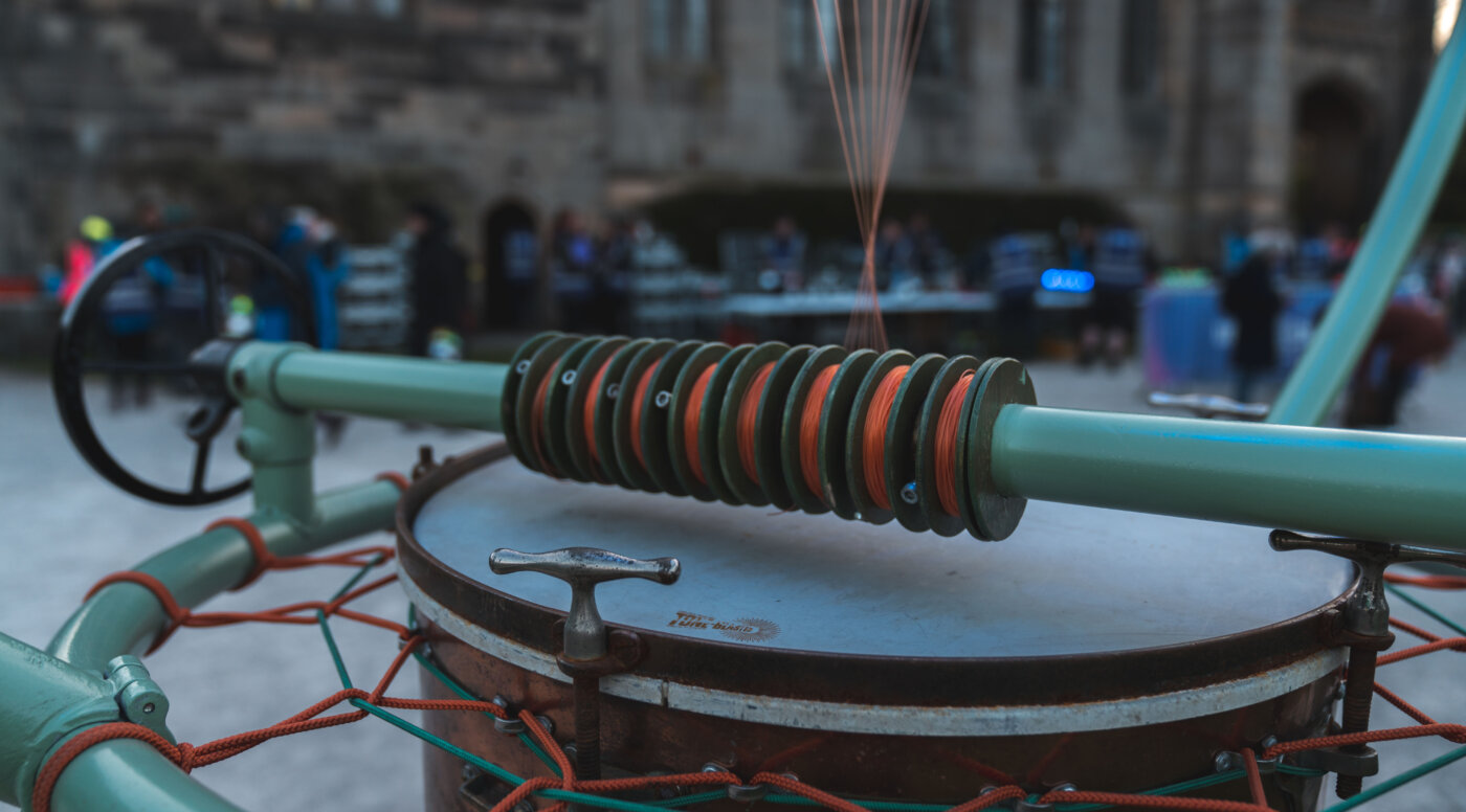 Attached to the centre of the timpani drumhead is a small hardwood bridge. It has holes for 8 nylon strings. A lyre shaped frame above the timpani has 8 nylon strings attached to it. The strings pass through the bridge to a system of tensioning reels. The strings are all tuned to the same note. As the wind blows, the strings vibrate invisibly, and harmonic sounds are produced. Described as a sound like a sci-fi choir. Tones that rise and decay with the wind. The sound is amplified by the timpani. Listeners can put an ear to the surface of the drumhead.