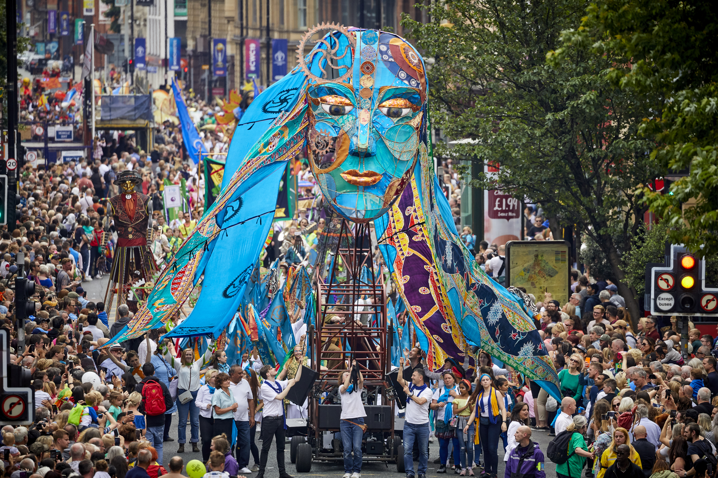 Once again, Manchester Day was heavily influenced and inspired by our shared green agenda with Manchester City Council. Everything in the parade was pushed, pulled, cycled, recycled and upcycled – and the only petrol-driven vehicle was the fire engine from Greater Manchester Fire & Rescue Service. It all served to win us a 4* Creative Green award from Julie’s Bicycle.