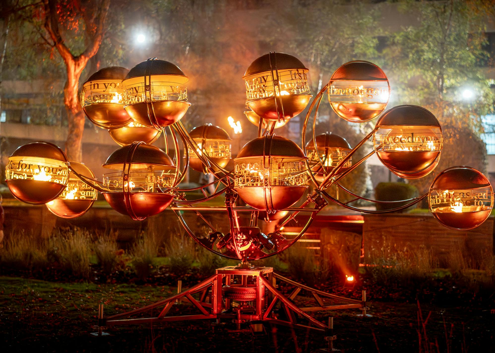 Other Marvels in this series of installations include The Passage by Mary Reynolds, an angel candle-inspired display featuring a metallic nest of fire at its core. The heat causes a convention current, making the two skeletal birds move to circle the nest, provoking a sense of serenity and wonder. Finally, The Fire Bird by Richard Broderick is perched majestically atop a metallic stand, enchanting audiences with its dynamic movements.