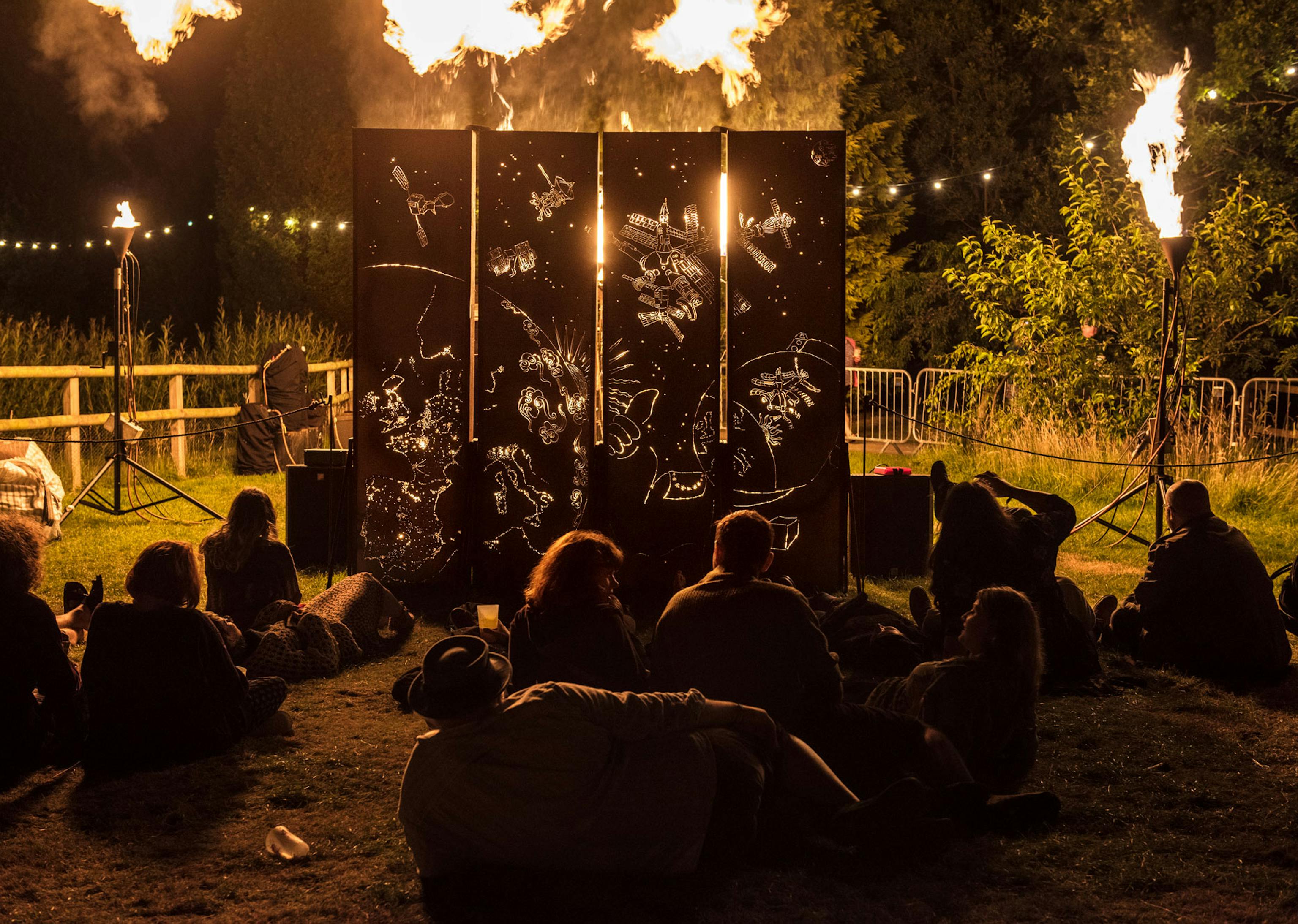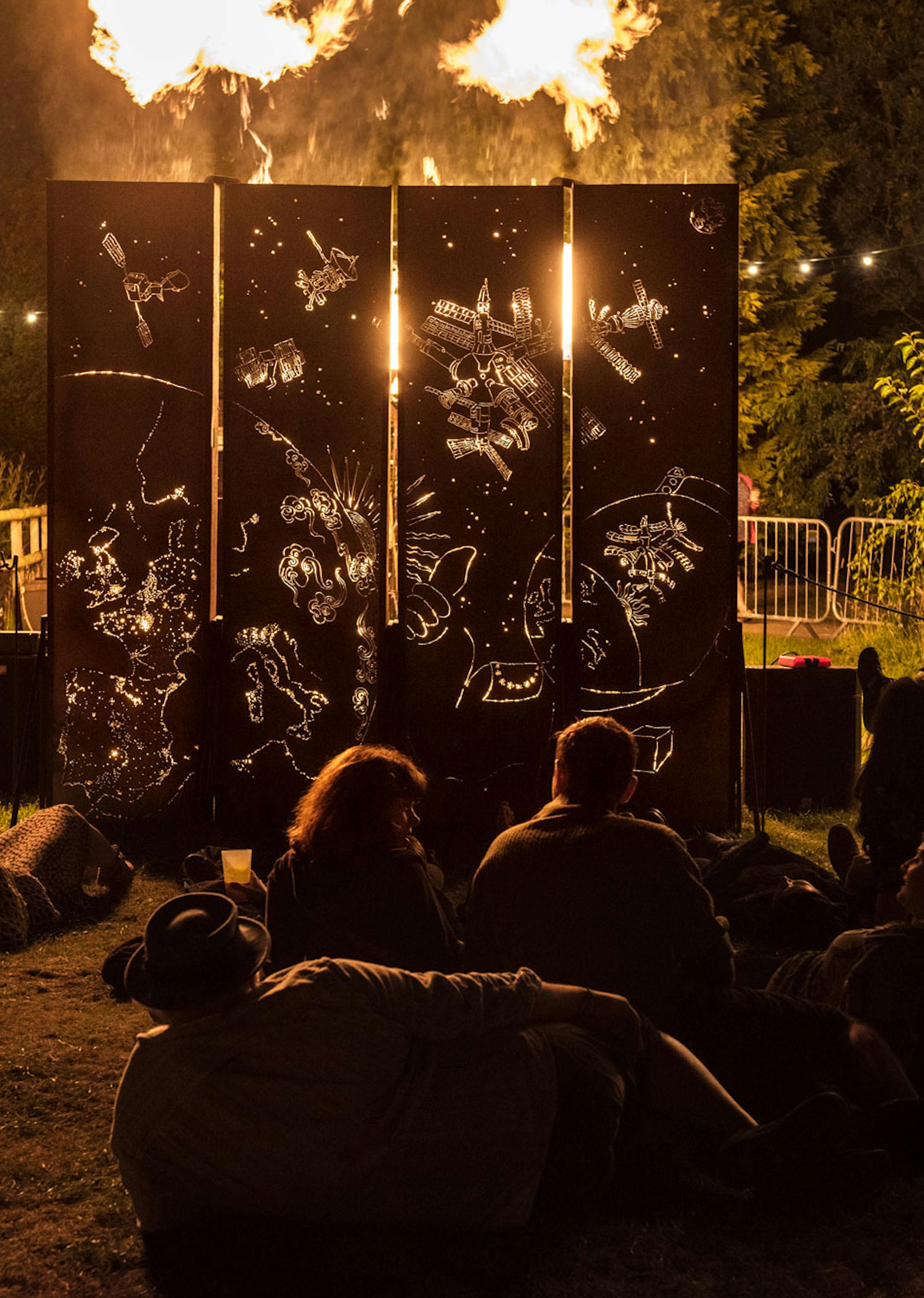 Then for 2019, we created Space Walk, a fiery light and sound experience comprising a series of fire-illuminated metal boxes designed by Hannelora Johansson, featuring plasma-cut images of lunar landscapes and the solar system. To mark the 50th anniversary of the Apollo moon landings, the soundscape included recordings of Neil Armstrong and Buzz Aldrin from the Apollo 11 and Lunar Module Eagle mission.