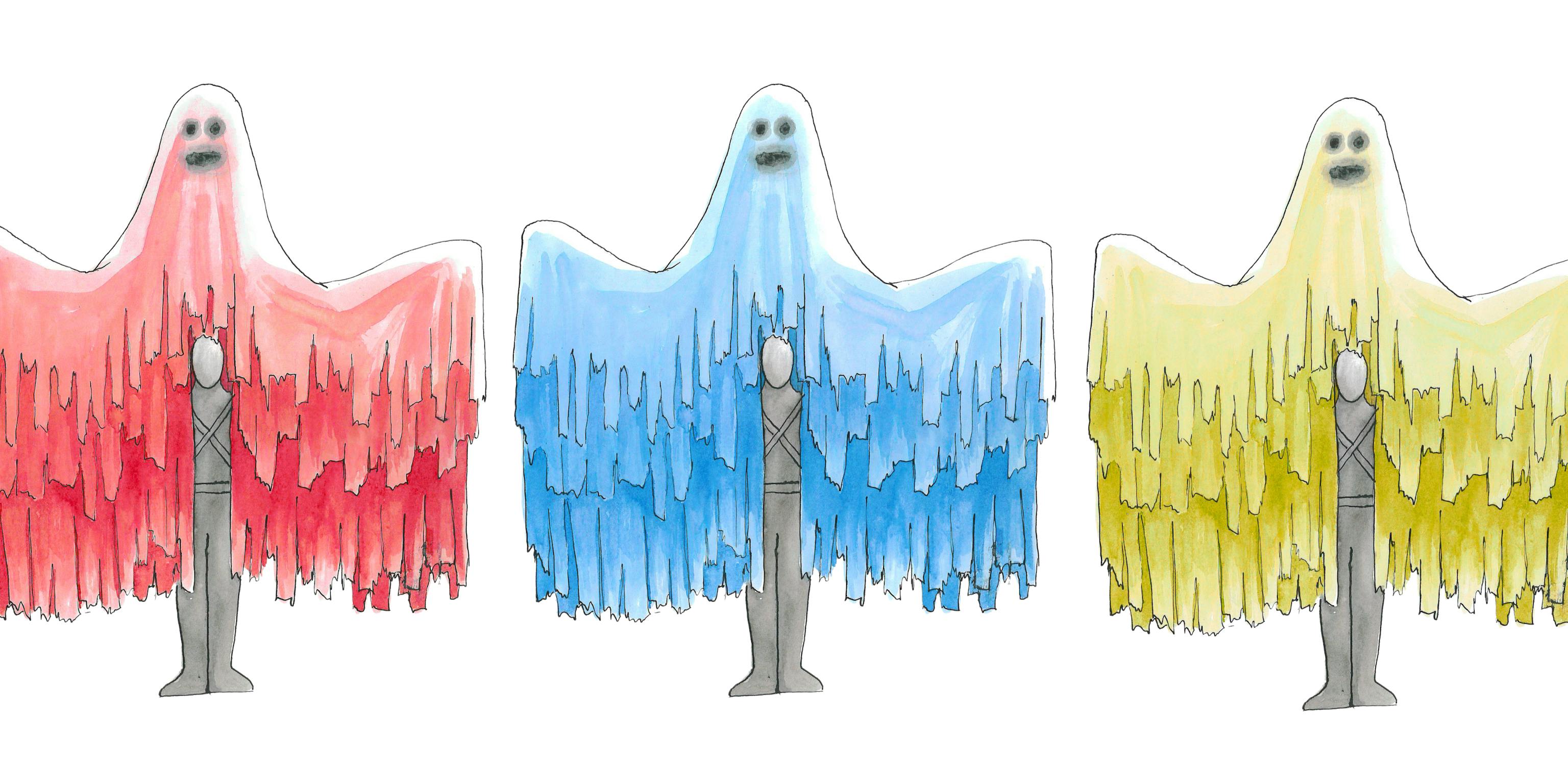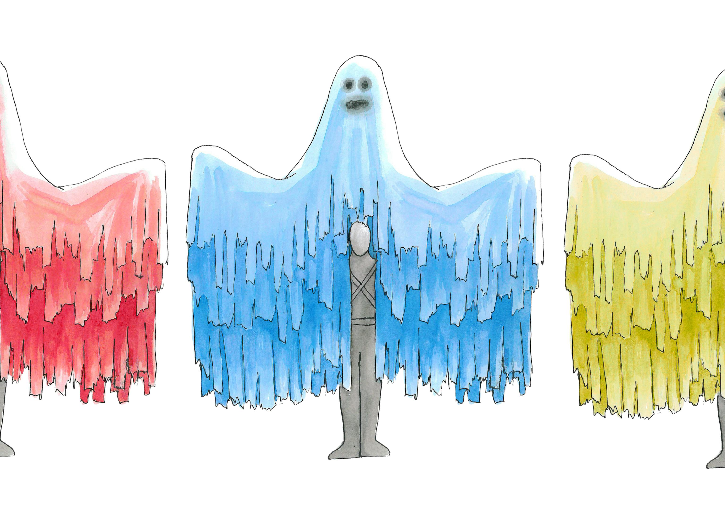 A mesmerising puppet dance troupe, each puppet embodying a unique ghostly character brought to life through vibrant, choreographed movement.
