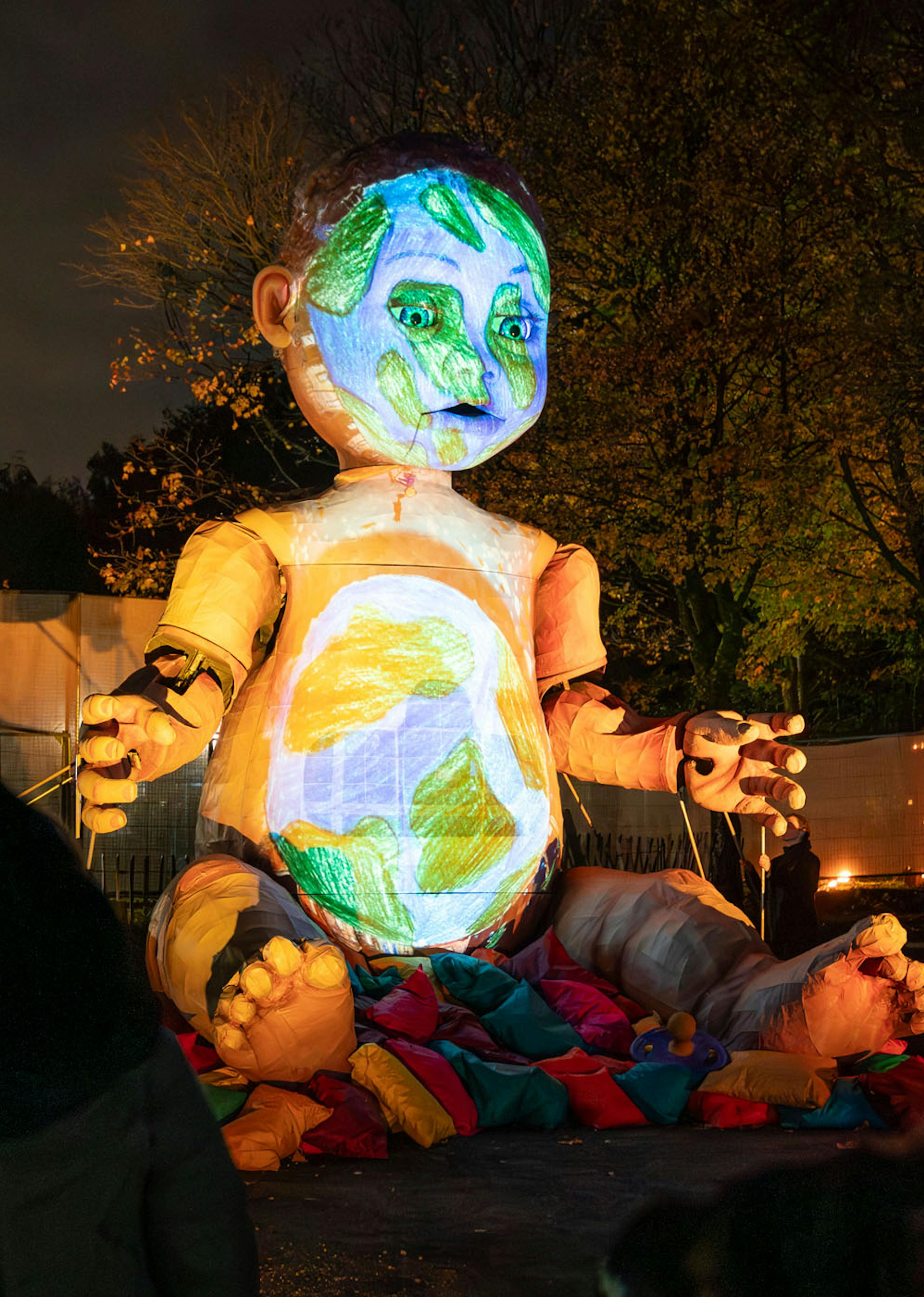 Audiences wandered through woodland discovering the wildlife that inhabits the area - badgers, moths, hedgehogs, owls - brought to life through lanterns, fire and magical installations, with sounds of rooks, owls and bats to enhance the experience. The centrepiece and final element in the journey was the giant Baby: the audience heard a sonic poem created by recording the children that visited the Baby outside the Town Hall in September. We used the words spoken by more than 300 children, accompanied by stunning projections of an imagined world.